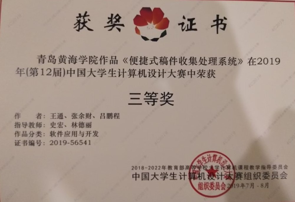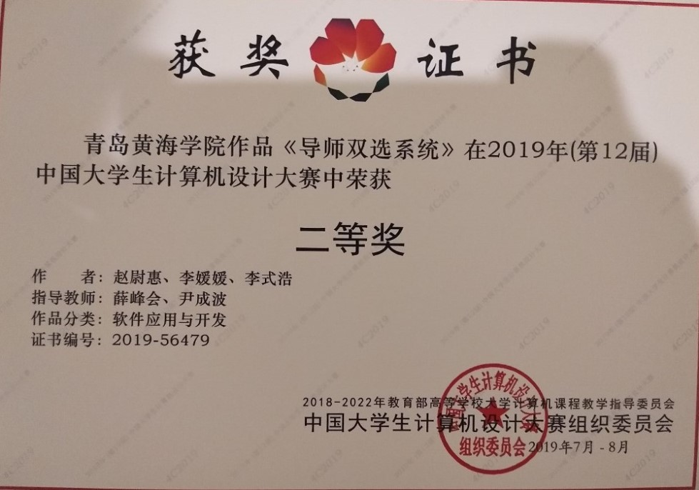 8月8日-12日,2019(第12届)中国大学生计算机设计大赛软件应用开发类全国总决赛在安徽师范大学举行。我校有两支队伍参加了此次大赛,其中由薛峰会、尹成波老师指导,赵尉慧、李媛媛、李式浩同学完成的《导师双选系统》作品荣获二等奖;史宏、林德丽老师指导,王通、张余财、吕鹏程同学完成的《便携式稿件收集处理系统》作品荣获三等奖。