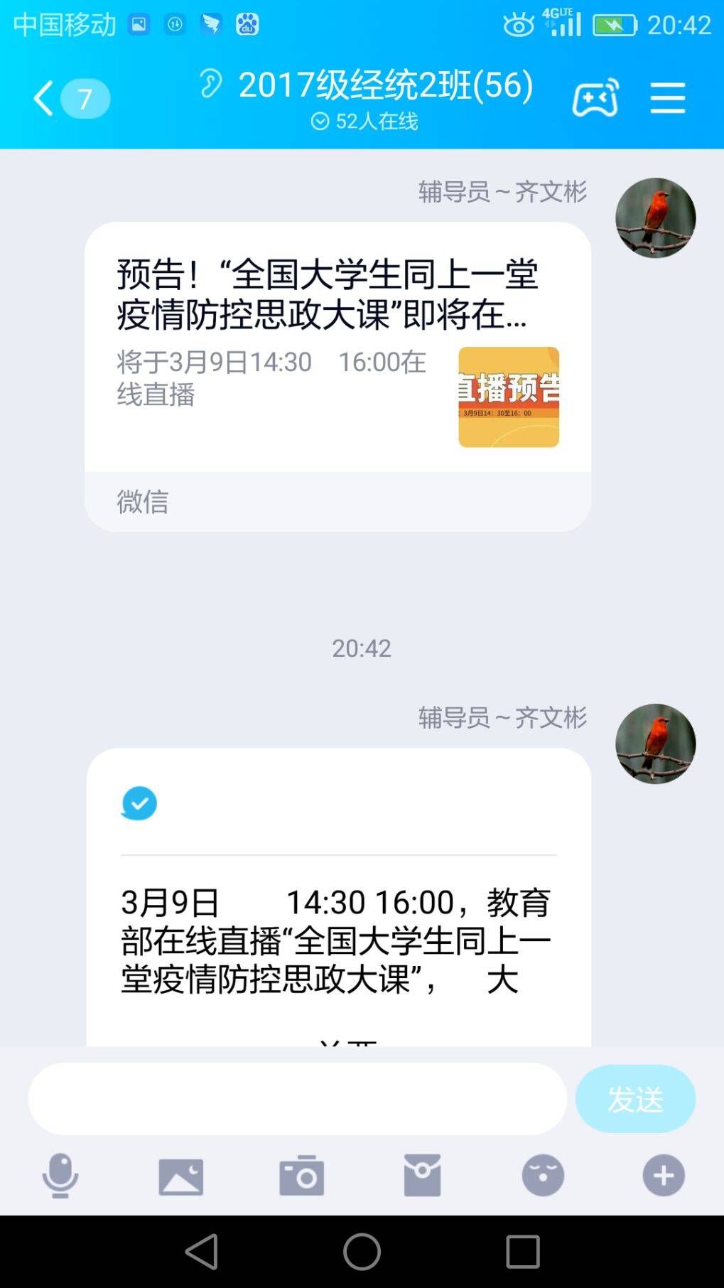 亲爱的们,我想对你说,我第一次接咱们7个班的工作,交接工作的时候,我从各位辅导员哪里了解了每个同学的情况,我想开学后我要用我十几年的辅导员经验,好好收拾你们一下,可我现在,只能通过屏幕熟悉每一个名字,通过语音听到你们的声音,通过班级群里“收到”两个字感觉到对我工作的支持,我也在每次群里发信息的时候,我都会加上“@全体成员,各位亲”,但我更想看到你们具有青春的面孔,张扬的自信。