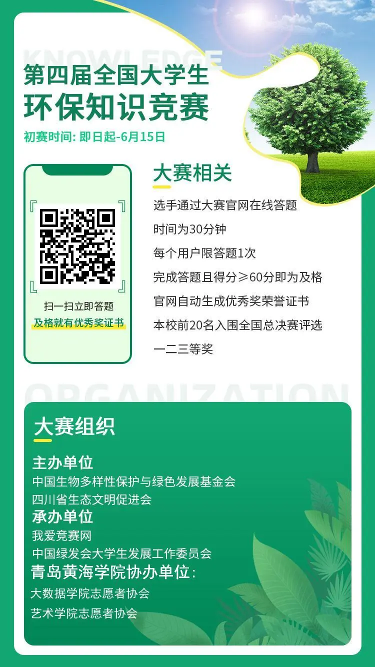大数据学院志愿者协会真诚的邀请您参加2020年第四届全国大学生环保知识竞赛,据说只要及格就能获得优秀奖荣誉证书,获得国家级荣誉证书。期待你的参与,你还在等待什么呢?