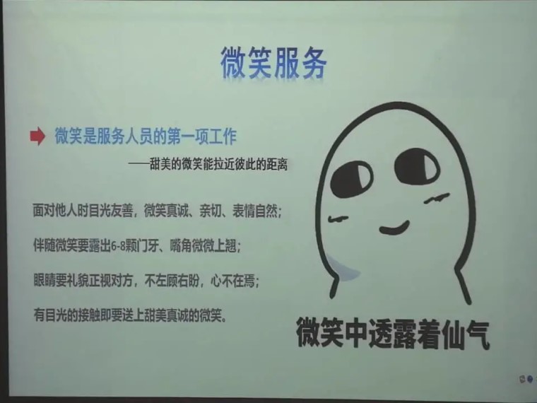 微笑服务,微笑服务是服务人员的第一项工作。甜美的微笑可以拉进人与人之间的距离。微笑时要做到真诚,亲切,表情自然,不要左顾右盼,心不在焉。