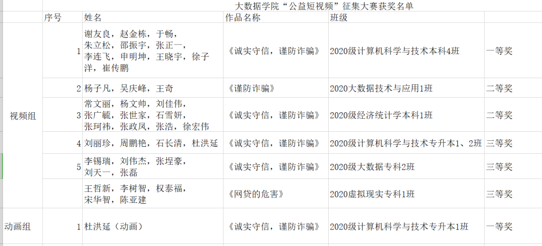 ■ 为加强学生的防诈骗意识,本周,我院举办了“诚实守信、谨防诈骗”公益短视频活动,让学生更进一步了解防诈骗知识。本次比赛采用评分制,经评选,最终决出获奖名单如下: