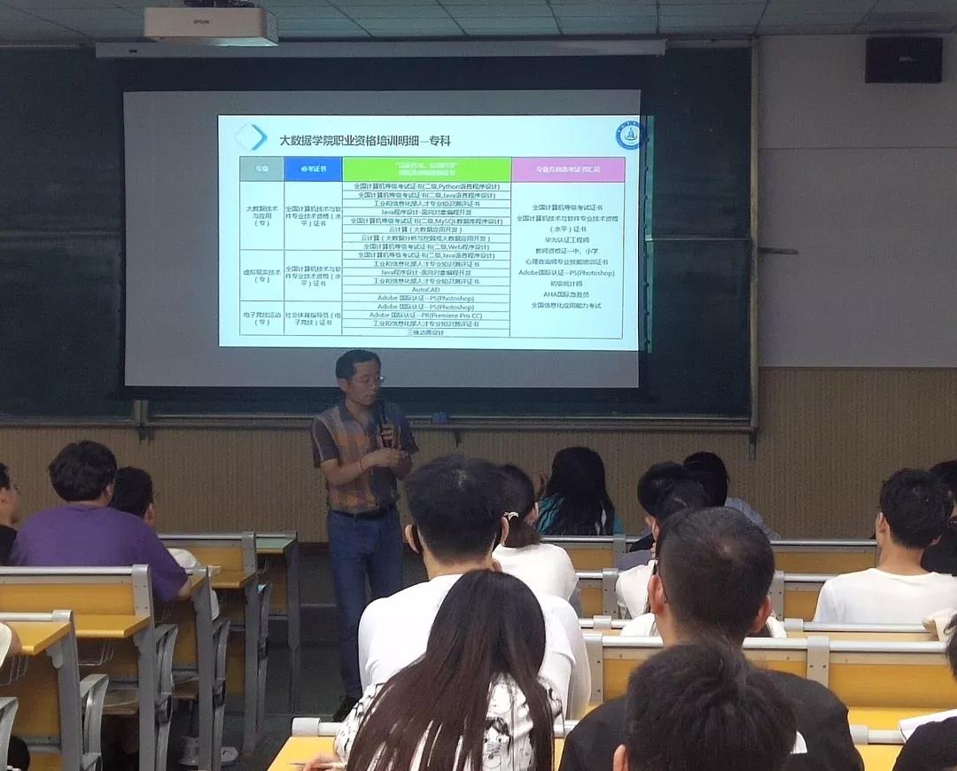 “学习改变命运,技能决定未来”——为开拓学生眼界,提升学生专业能力,近日,“1+X”证书制度宣讲会于知新楼二楼东配举行,大数据学院18、19、20级本科、20级专科班长及学委共同参与,由继续教育中心刘金田老师主持。