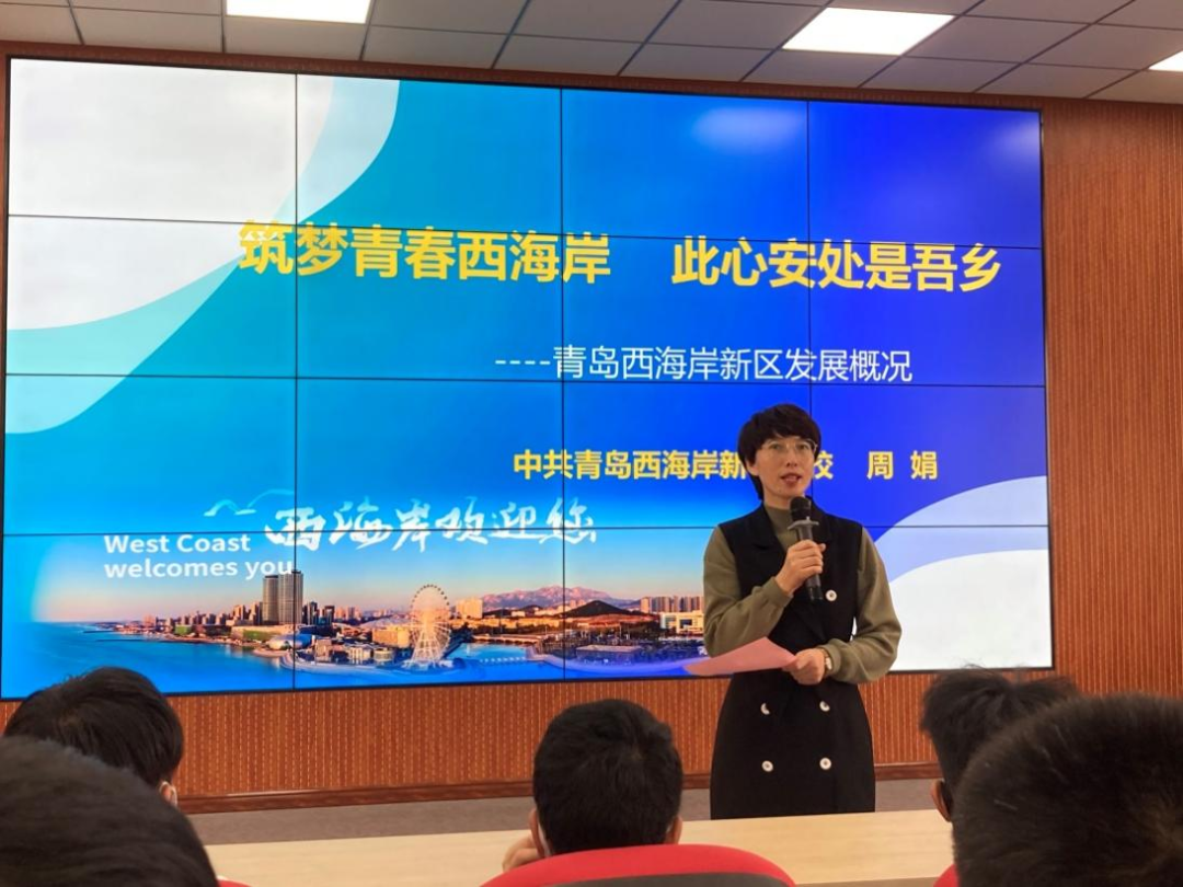 接下来,周娟老师以《筑梦青春西海岸,此心安处是吾乡》为题从时尚新区、现代新区、开放新区、活力新区四个方面对青岛西海岸新区的发展概况做了详细介绍。