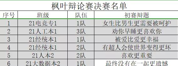 宏辞论道,以说会友。为推进我校文明建设,提高大学生综合素质,培养大学生语言表达能力、思辨能力,增进各班同学们的友谊,加强同学们之间的合作与交流。大数据学院举办具有本院特色的“枫叶杯”全院辩论赛,以丰富学院活动形式,打造学院积极正面的形象。给你一个选择,上演属于一个团队的精彩;给你一个辩题,开创属于团队的天地。经过辩手认真的准备,激情的碰撞,辩论的盛宴,现已拉开序幕。