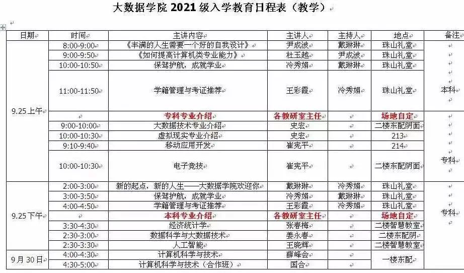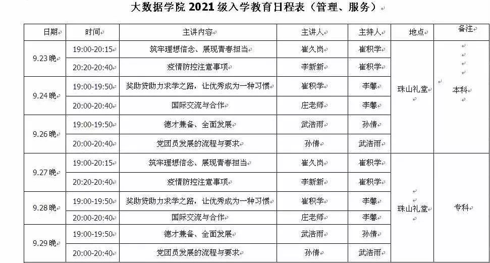 为帮助新生了解学习生活,让新生及时从假期中回归正轨开启新旅程。2021年9月25日起,大数据学院2021级入学教育分别在知新楼二楼东报告厅和珠山礼堂举行。此次入学教育主要分为教学与管理服务两部分,分别围绕新起点新人生、理想信念、学业规划、奖助贷、学籍管理、考证推荐、各个专业介绍等全方位展开,分别有学院领导和骨干教师主讲,2021级全体本科生与专科生分批次参与。