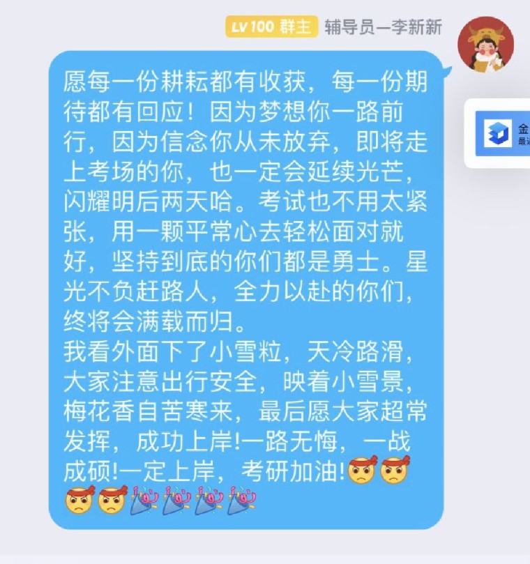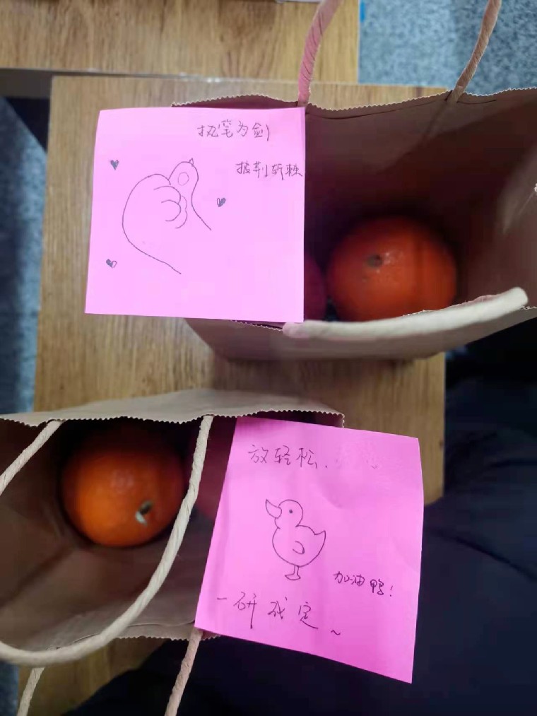 考试前夕辅导员和考研学生进行了亲切交谈,鼓励慰问、加油打气。告诉学生,学院是同学们的坚实后盾,相信自己不是一个人在战斗!大家调整好心态,树立信心、坚定信念,在考场上“细心”、“沉着”应对考试,星光不负赶路人,时光不负追梦人!