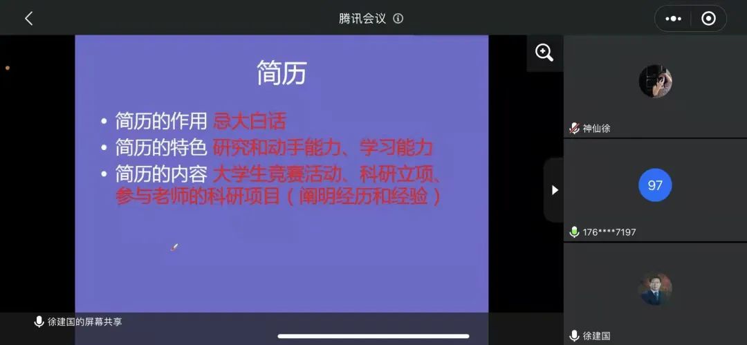 会上,徐老师首先肯定了考研学子为考研的辛勤付出,对大家取得的成绩表示了祝贺。其次为同学们具体分析了当前的考研形势和考研的重要意义,据统计2022届研究生招生考试报考人数达457万人。徐老师就当前疫情形势下全国研究生招生政策与形式做了解读,针对考研复试的主要流程、面试技巧、复试英语的准备以及考研院校、专业调剂等重点关注的问题进行了详细的讲解,帮助学子更透彻、直观地了解考研复试的内容和备考方法。同时,徐老师从复试的主动性、调剂目标的选择等问题做了进一步的说明,强调要认清楚当前的考研形势,积极主动申请院校调剂工作。考研不仅能够提高个人文化水平,另一方面也能够切合当今就业市场所需高科技人才的缺口,同学们可以通过考研来提升自己的学习能力、工作能力以及社会竞争力,这样才能更好的适应社会。