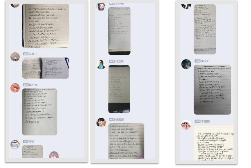 课堂中除了教师的讲课之外,更重要的是看学生的学习情况,线上课程老师不能更好的及时的观察学生的学习情况,所以通过互动来了解学生尤为重要,我主要是通过QQ群课堂的互动和QQ群中的互动与学生更好的沟通,QQ群课堂中的互动主要是通过语音连线的方式,更多的互动体现在QQ群中,讲完一个知识点,同学在群中回复听懂的同学回复1和听不懂的回复2,听起来很费时,但是实际操作很快,有助于我及时的了解学生,同学们上课都跟的很紧,讲完一个知识点,马上有练习和巩固,同学们在练习本上做完之后,立马发到群里,这也是作为课堂过程评价积分的一个重要途径,课程改革要进入实处,真正落实到同学们的上课中来,对学生过程考核的一个有效和真实的评价,同学们都非常积极,现截图看一下同学们的平时上课互动的练习情况。每个同学的练习情况一目了然。也方便课后查看。