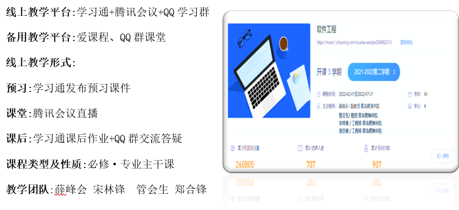 软件工程教学团队在疫情防控期间探索出“学习通+腾讯会议+QQ群”具体线上教学形式。教学过程中强调“课程思政”的有机融合、优化线上教学策略,积极应对学生的反馈,有效达到课程的教学目的和育人目标,旨在把“课程思政育人”和软件工程的学习有机结合起来,实现如盐入水、润物细无声的教学触感,实现显性与隐性教育的有机结合,从而将教育育人落实到细微之处。