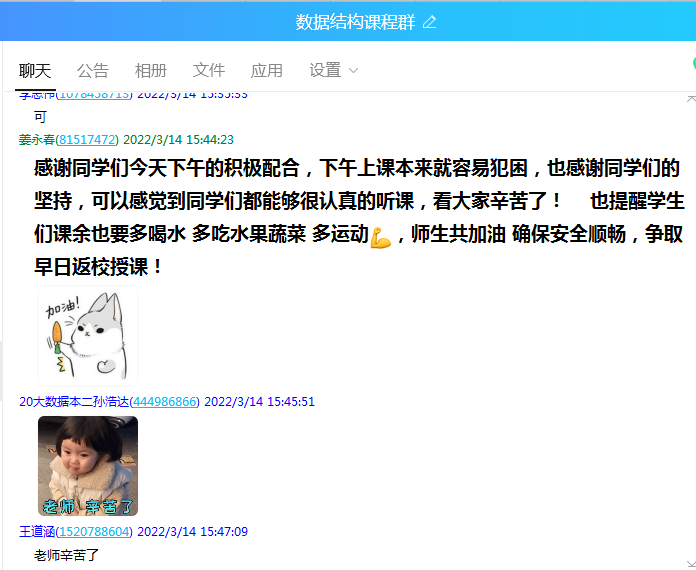 分别在学习通和QQ群建立班级群,并通知学习课程的上课时间和需要的准备工作,让学生提前熟悉课程内容。学生积极到教室上课,班主任老师每节课都提前组织学生在教室上课。课前通过QQ群向学生宣传在疫情期间一些感人事迹,向那些英勇的“逆行人”致敬,并提醒学生合理膳食,安排学习、休息时间,多进行体育锻炼等,指导学生放松身心的同时提高学习效率。