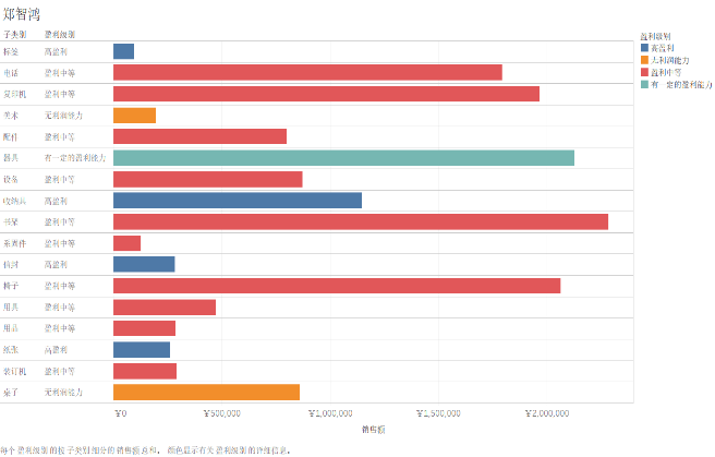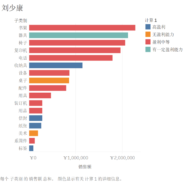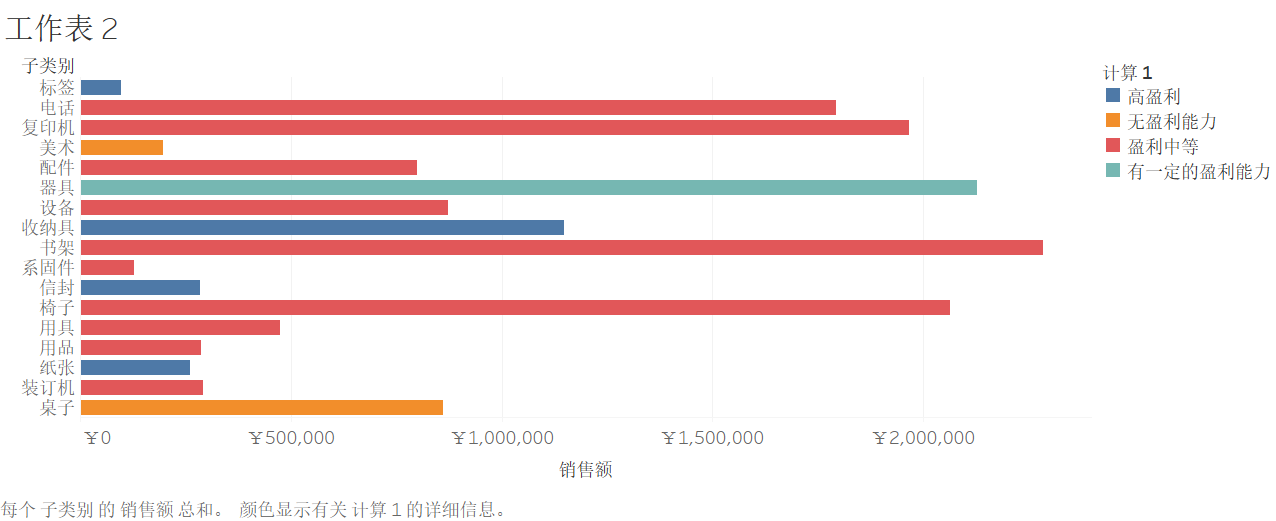 3.生成盈利级别字段。进行任务生成。把子类别拖动到行,销售额拖动到列,盈利级别映射到颜色。
