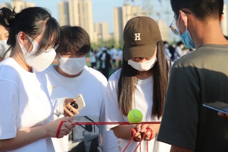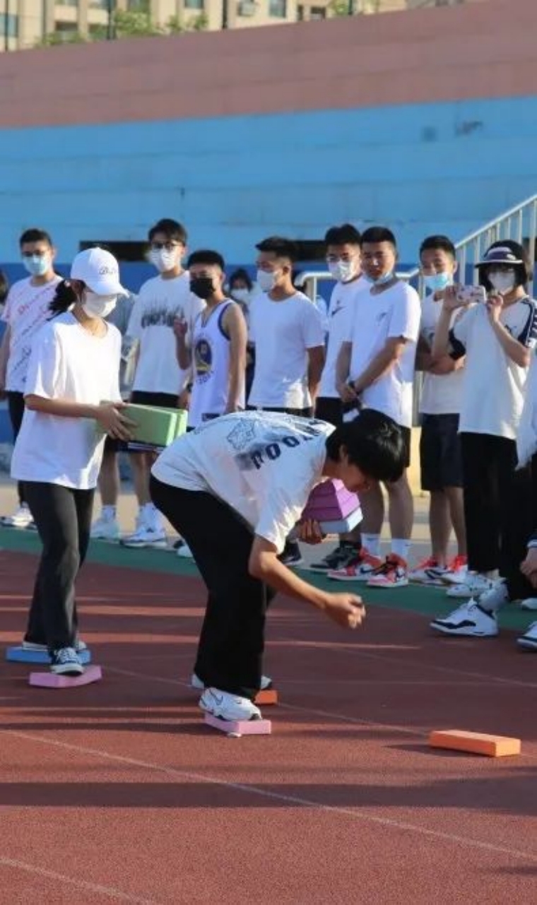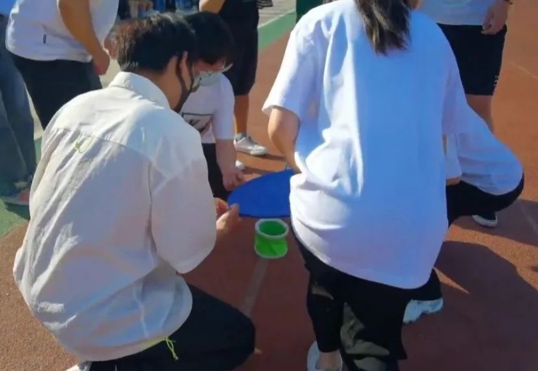 参赛人员需将双腿捆绑在一起,来通过40个小圈且只能在圈里行走。这一项目十分考验同学们的默契与配合呀,它的艰难程度堪比月球漫步哦~
