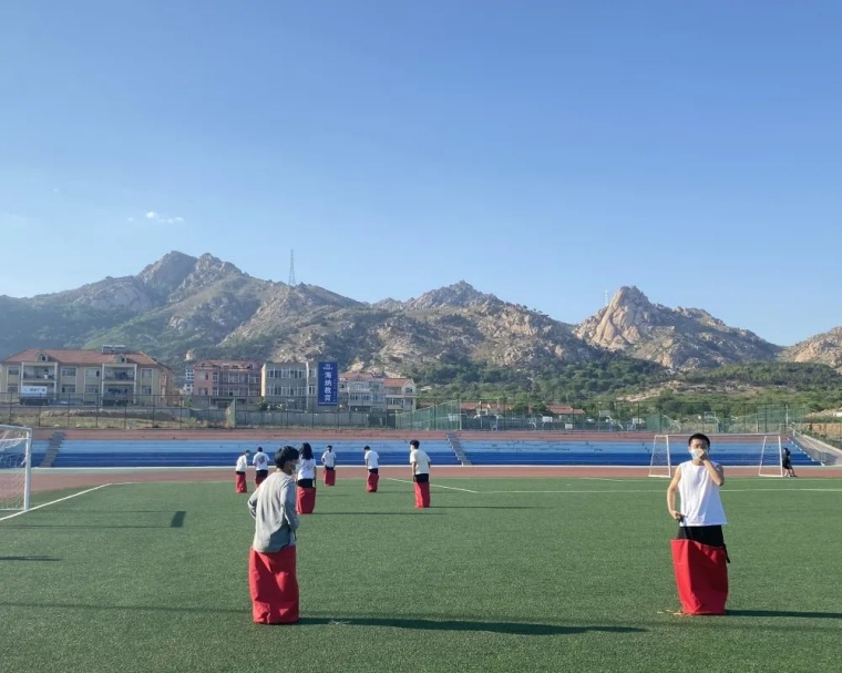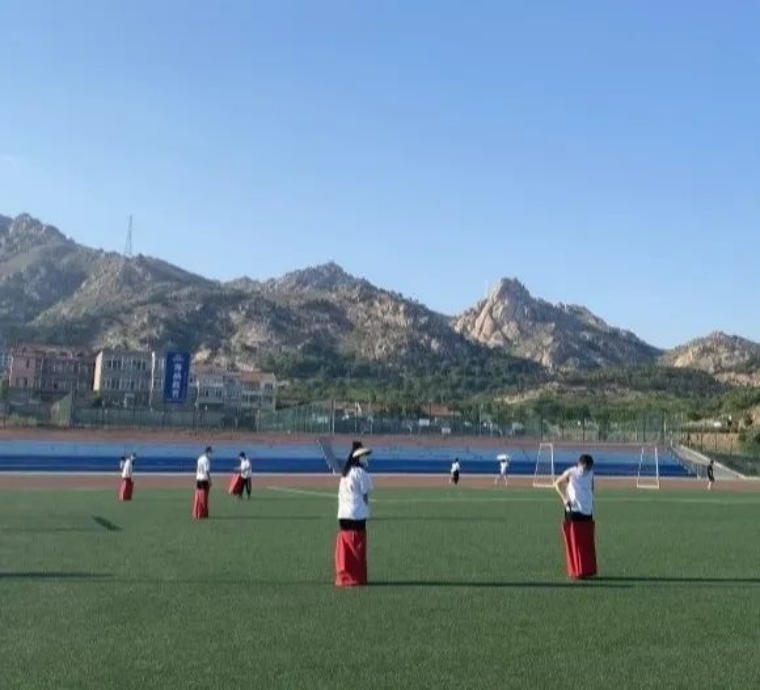 八名队员进入袋鼠跳袋进行接力,同学个个奋力拼搏,体现了同学们良好的精神面貌,斗志昂扬的青春活力。