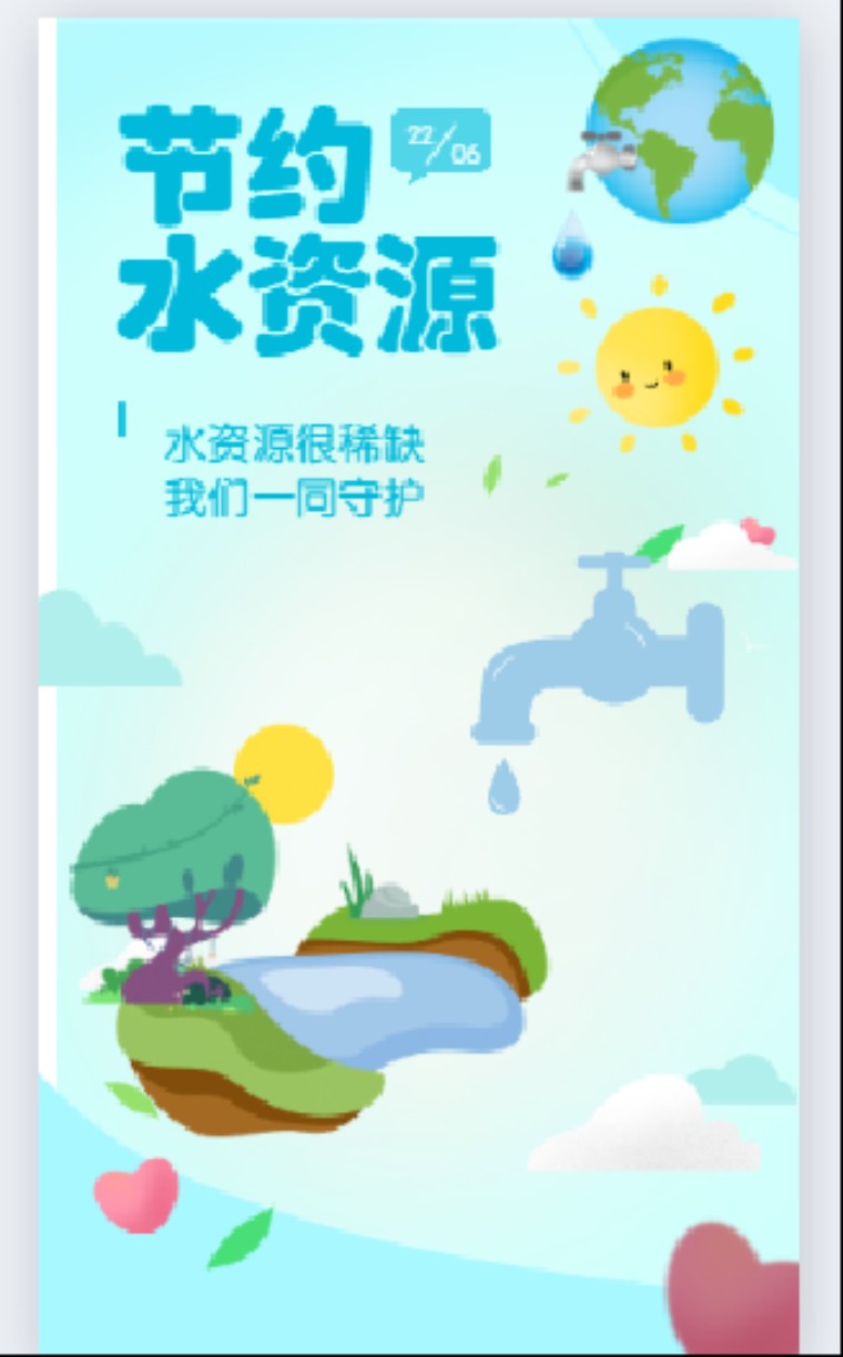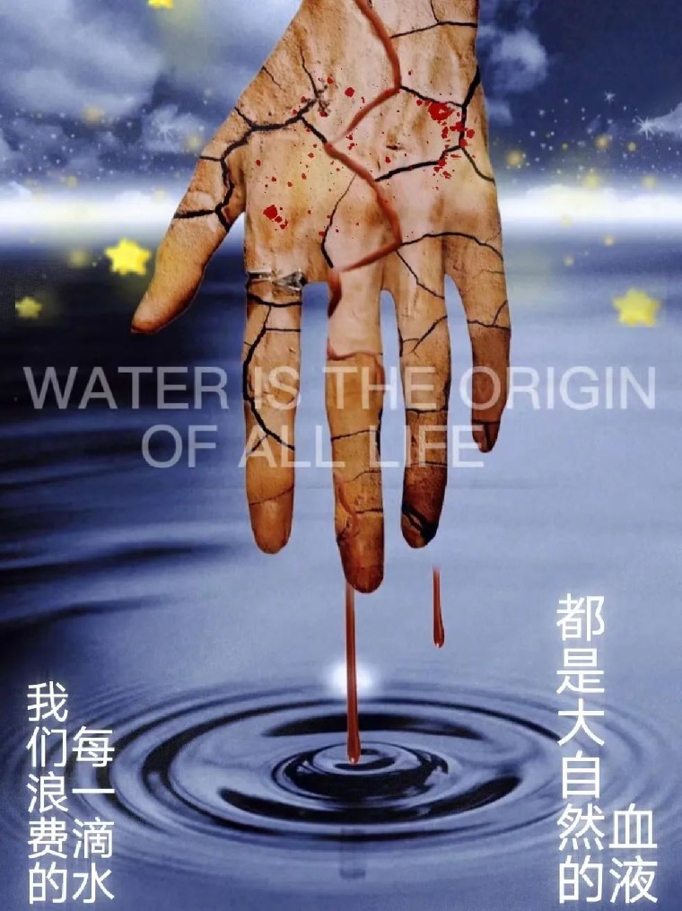 每一滴水都住着千年万年的灵魂,为了滋养我们年轻的灵魂而来到地上,节约用水,拯救地球。