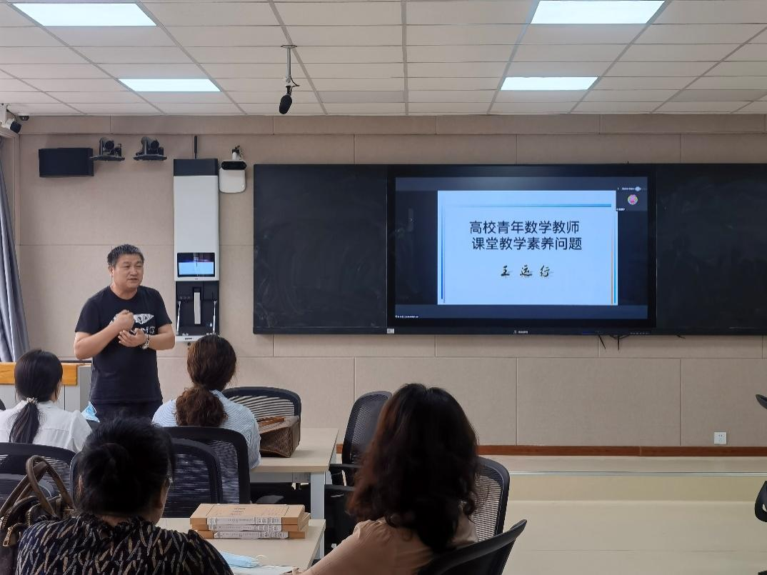 在数学老师分会场,王运行教授以《高校青年教师课堂教学基本素养》为题,详细阐述了高校数学教师教学素养基本要求,提出了数学老师的教学素养新要求,对教学素养提升实现路径给出了建议。