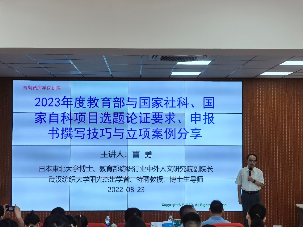曹勇教授作了题为《课题的申报、论证》的报告,就2023年度教育部与国家社科、国家自科项目选题论证要求做了深刻分析,详细指导我院教师进行申报书撰写,用实际案例传授申报书撰写技巧,最后通过项目申报三境界:探索、奋进、惊喜圆满结束了本次报告。