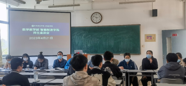 为了充分发挥我校学生在数学教学中的主人翁作用,引导广大学生为数学教学建言献策,进一步深入听取学生的意见建议,满足青年学生成长成才的需求,提升我校数学教学服务育人的针对性。4月21日在知行楼203召开学生座谈会,我院院长助理张德存教授、智能制造学院教学秘书宋慧、数学教研室主任张振荣和王晓燕、10名数学教师代表及智能制造学院29名学生代表参加座谈活动,会议由我院教学秘书仇晓瑜老师主持。