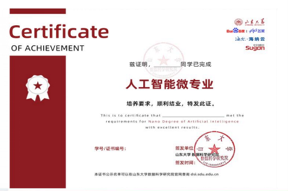每完成一门必修课程,即可获得山东大学、百度飞桨、海尔·海纳云、中科曙光联合认证的单门结课证书;完成全部六门必修课程,将获得山东大学、百度飞桨、海尔·海纳云、中科曙光联合认证的“人工智能微专业”证书。
