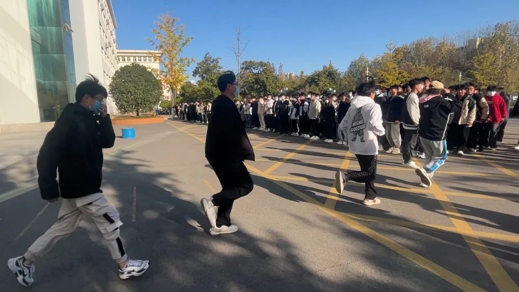 师生安全疏散到知新楼前广场,各班负责人向大数据学院负责人汇报应到实到人数,学院负责人向赵部长汇报应到总人数实到总人数。