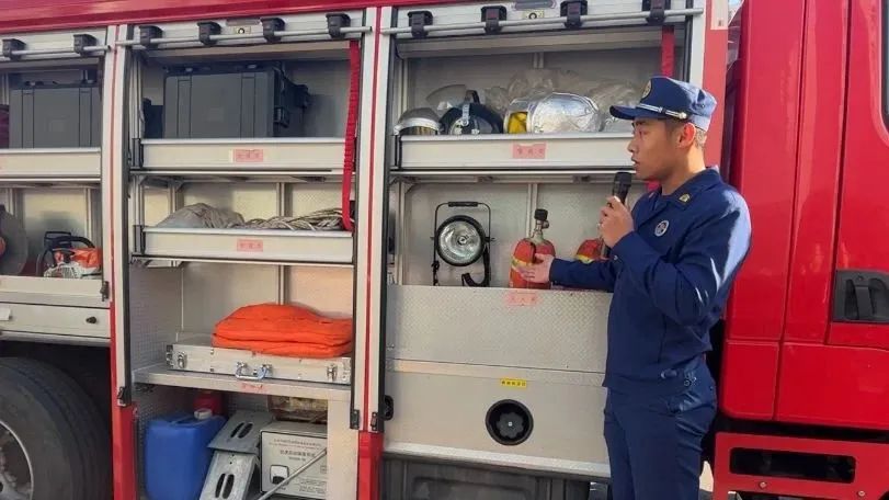灭火演练结束后,消防队队员向全体师生展示消防车使用功能。