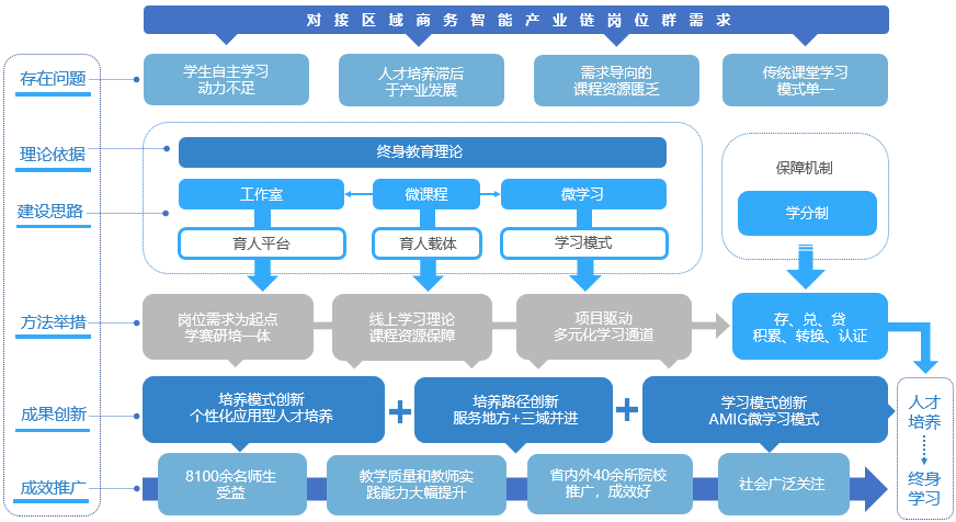 终身教育理论是指人们在一生各阶段当中所受各种教育的总和,是人所受不同类型教育的统一综合,包括教育体系的各个阶段和各种方式,既有学校教育,又有社会教育,既有正规教育,也有非正规教育。主张在每一个人需要的时刻以最好的方式提供必要的知识和技能,终身教育思想成为很多国家教育改革的指导方针。雷竞技的赛事积分为培养商务智能跨学科人才,以终身教育理论为指导,以促进其个性化发展为目的,建设了适应学生自身学习需求的微专业,搭建了微课程育人载体,以提高其终身学习能力和可持续发展能力作为长远人才培养目标。