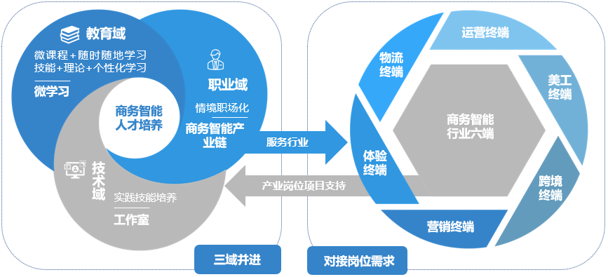 以工作室和微学习为战略高地,学生专业技能与职业需求深度匹配,打造了知识(教育域)、技能(技术域)、产业(职业域)三域并进,实现了教育服务地方行业,助推商务智能产业发展的融合道路。“学赛研培一体”和个性化发展策略,促进了商务智能行业运营终端、营销终端、物流终端、体验终端、美工终端、跨境终端的六端融合,推动了商务智能产业链的“嵌入式”发展(见图6“三域”并进产教融合新路径)。