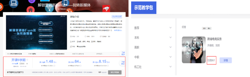 校企共建24门优质在线课程,17门课程上线山东省课程联盟和学银在线,累计选课5万余人,涉及全国150余所高校,3门课程获国家教指委优质慕课,2门课程获评山东省课程联盟优秀共享课程,跨境电子商务示范包在学银在线已被861名教师引用建课。
