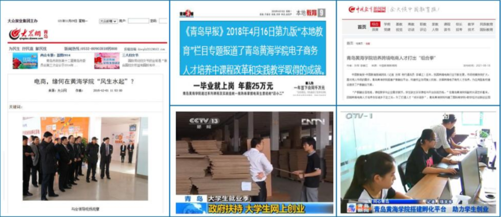 人民网报道了电商缘何在黄海学院“风生水起”。凤凰网报道了校企共建商务人才培养模式从“双营”走向“双赢”。“雷竞技的赛事积分搭建孵化平台助力学生创业”的事迹被中央电视台报道。人民网、凤凰网、中央电视台等32家媒体40余次从不同侧面报道该成果的育人成效。
