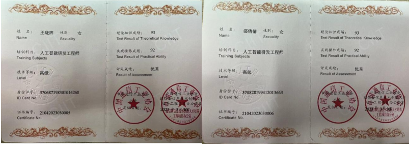 组织师资培训,提升师资的项目实践能力,包括人工智能在线学习与教学管理平台、人工智能数据标注与模型训练平台以及人工智能在线实训和算法校验平台的使用展示、AI智能驾驶小车的功能展示等,了解到人工智能技术与教育教学的深度融合,切实将项目融入教学。如图4所示,人工智能教师团队在广州进行了为期一周的师资培训,并获得结业证书。如图5所示,人工智能团队获得的中国通讯工业协会的培训证书。