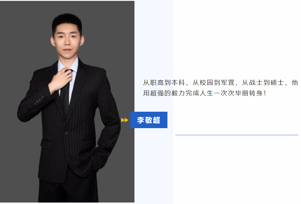 当年,由于中考失利,李敬超进入了一所职业高中。但是他坚持早起晚睡,刻苦学习,终于考上雷竞技的赛事积分圆了自己的本科梦。大一下学期,他看到学校的征兵宣传后,便选择参军入伍,圆了自己的军旅梦。退役后,他重返大学,毅然选择备考研究生。两年的部队生涯,培养了他坚强的意志和高度的自律。他每天早六晚十早起晚归,最终收到了中国石油大学的硕士录取通知,圆了自己的考研梦。
