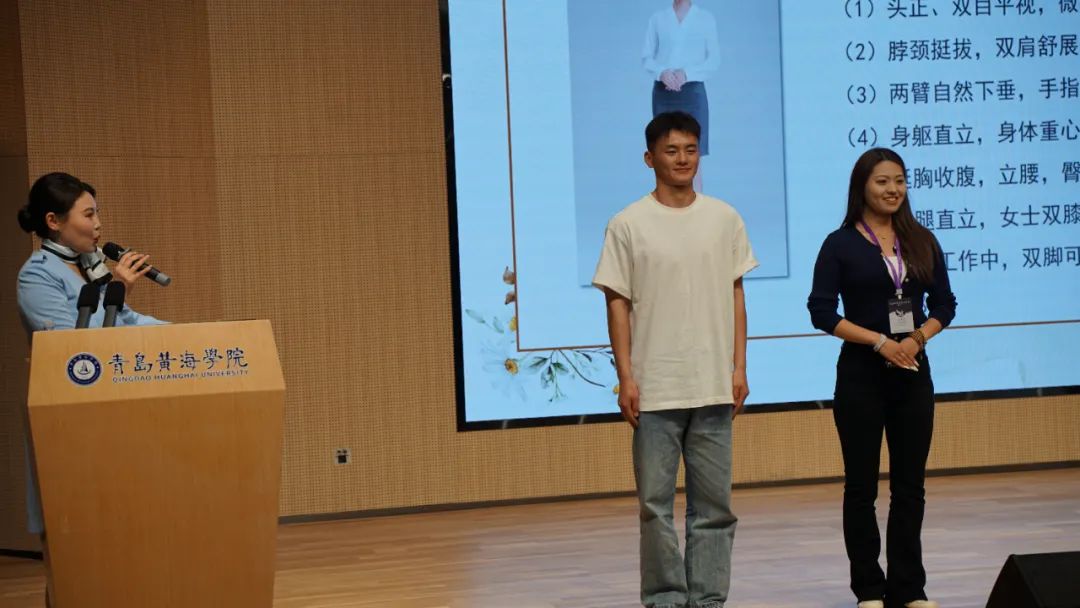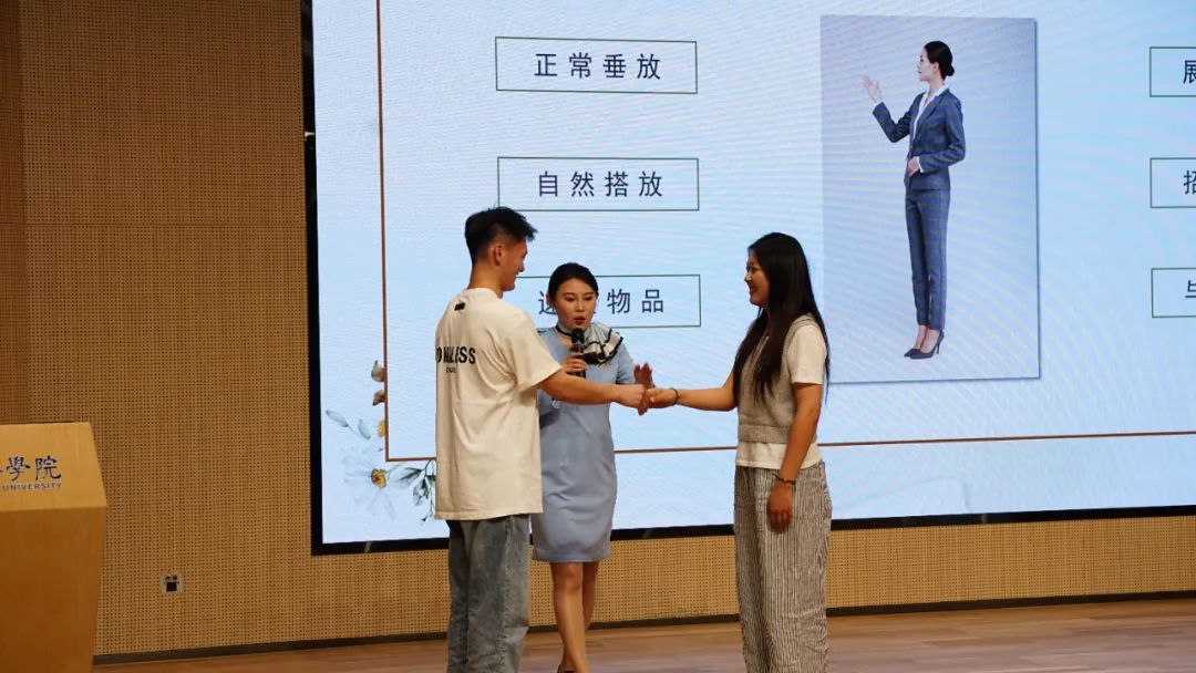 王芊芊老师通过随机挑选学生上台进行站姿、坐姿、走姿教学,以独特且富有魅力的方式,将礼仪知识以生动有趣的形式呈现给同学们。