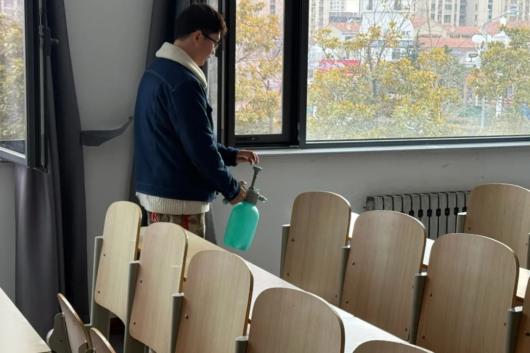 志愿者们迅速集结,明确分工,他们逐一打开宿舍楼、教学楼的所有窗户,确保室内空气流通。随后带着消毒剂,对教室、走廊、楼梯、门把手等高频接触点进行了全面细致的喷洒与擦拭,有效杀灭潜在病毒与细菌,为同学们营造一个更加安全、健康的校园环境。