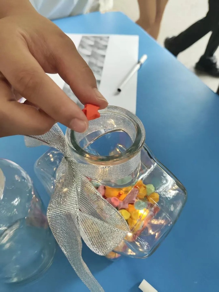 随后,大家将写满心事的星星纸、便签小心翼翼地折叠,轻轻放入漂流瓶中。透明的瓶身裹着细碎的阳光,一个个承载着秘密的漂流瓶,在众人手中传递、汇聚,最终被郑重投入大海。当漂流瓶随着海浪缓缓漂远,那一刻,仿佛所有的烦恼都被海水溶解,所有的愿望都乘上了远航的船。
