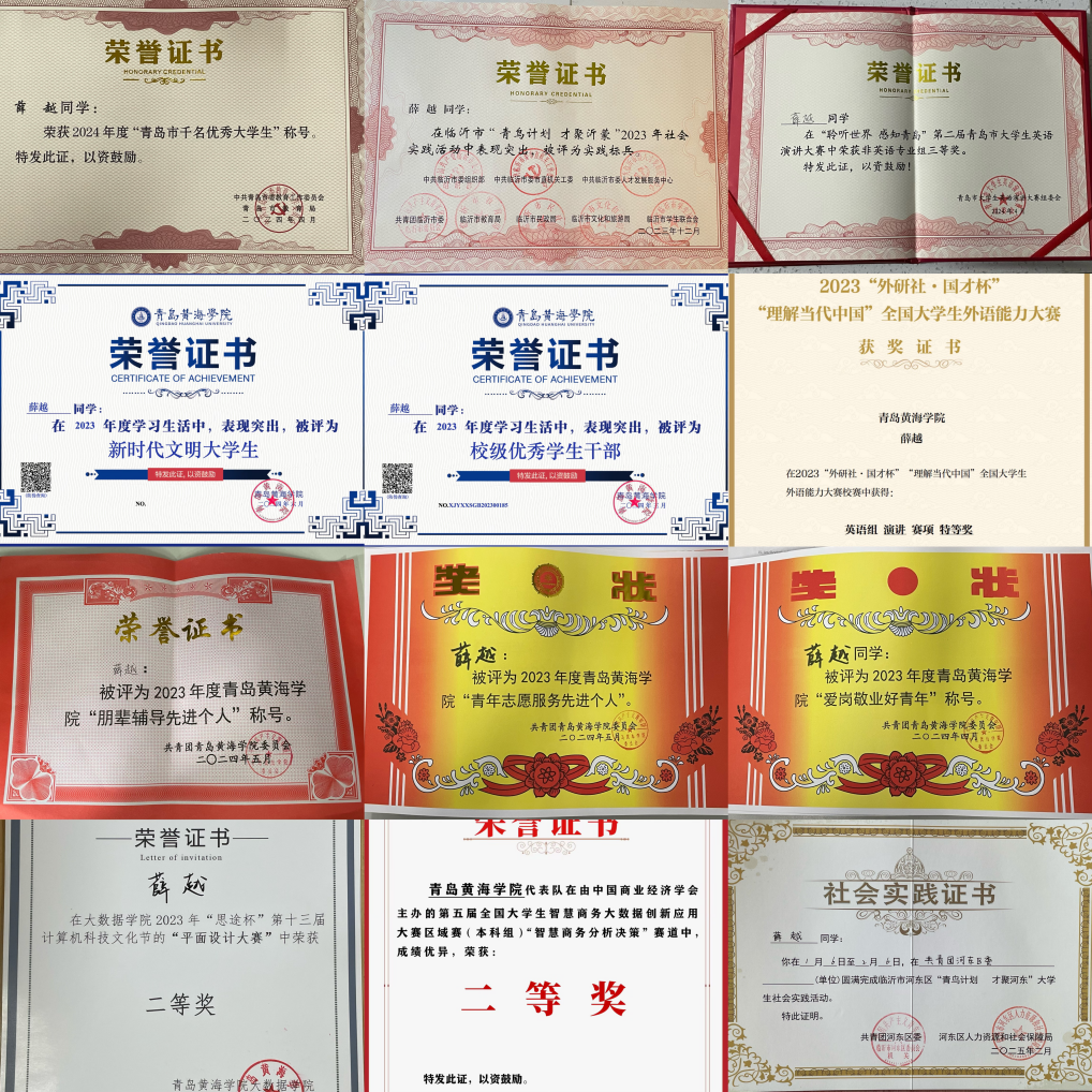 面对学习,薛越的表现同样精彩。她认真学习计算机专业相关知识,不断提高自己的英语水平,一次性通过大学四六级考试。她坚持全方位提升发展,通过参加蓝桥杯、大唐杯信息技术大赛等来锻炼自己的专业技能,培养自己独立思辨和创新能力,荣获“青岛市千名优秀大学生”称号。在各类比赛场上,她过关斩将,不惧挑战,斩获“外研社·国才杯英语演讲比赛特等奖”“思途杯·平面设计大赛二等奖”“智慧商务大数据创新应用大赛二等奖”等奖项。