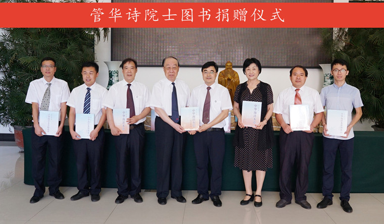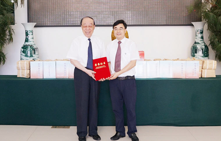 上午,管华诗院士还将自己主持编著的我国首部大型海洋药物典籍——《中华海洋本草》捐赠给学校,这部典籍为我国海洋中药的研发奠定了坚实的资料基础。习近平总书记在青岛海洋科学与技术试点国家实验室考察时,也曾翻阅过这部典籍。