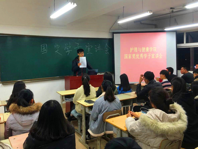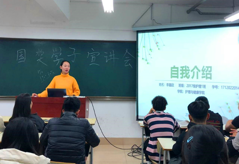 为进一步促进护理与健康学院学风建设,充分发挥国家奖学金优秀学子先锋模范带头作用,让同学们更加深入了解国家奖学金评审相关条件及要求。护理与健康学院资助工作小组于11月25日晚在知新楼645教室开展了“2019年国家奖学金优秀学子宣讲会”。本次宣讲会由我院资助分管老师王海宁主持,2019年获得国家奖学金的李嘉欣同学主讲,各班优秀学生代表出席了本次宣讲会。