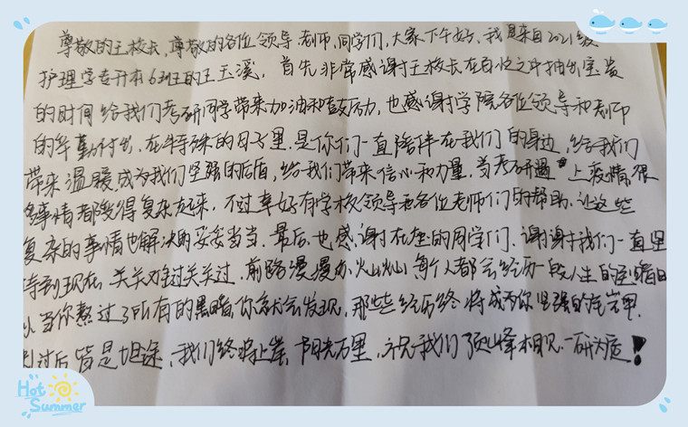 考研学子曾令卓表示:想借此机会感谢学校和老师的“研”途相伴。在疫情期间,学校每一个举动都在温暖着我们,让我们看到了黄海的责任与担当,为我们备考化解了焦虑,创造了良好的学习环境。