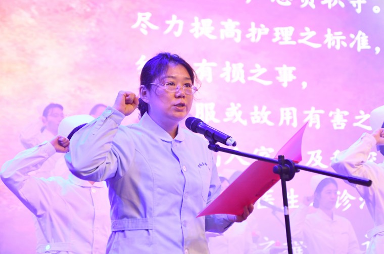 全体医学院学生面对南丁格尔像,许下神圣誓言,他们将继承和发扬护理事业光荣传统,以强烈的事业心和高度的责任感,把真诚的爱心无私奉献给每一位患者。