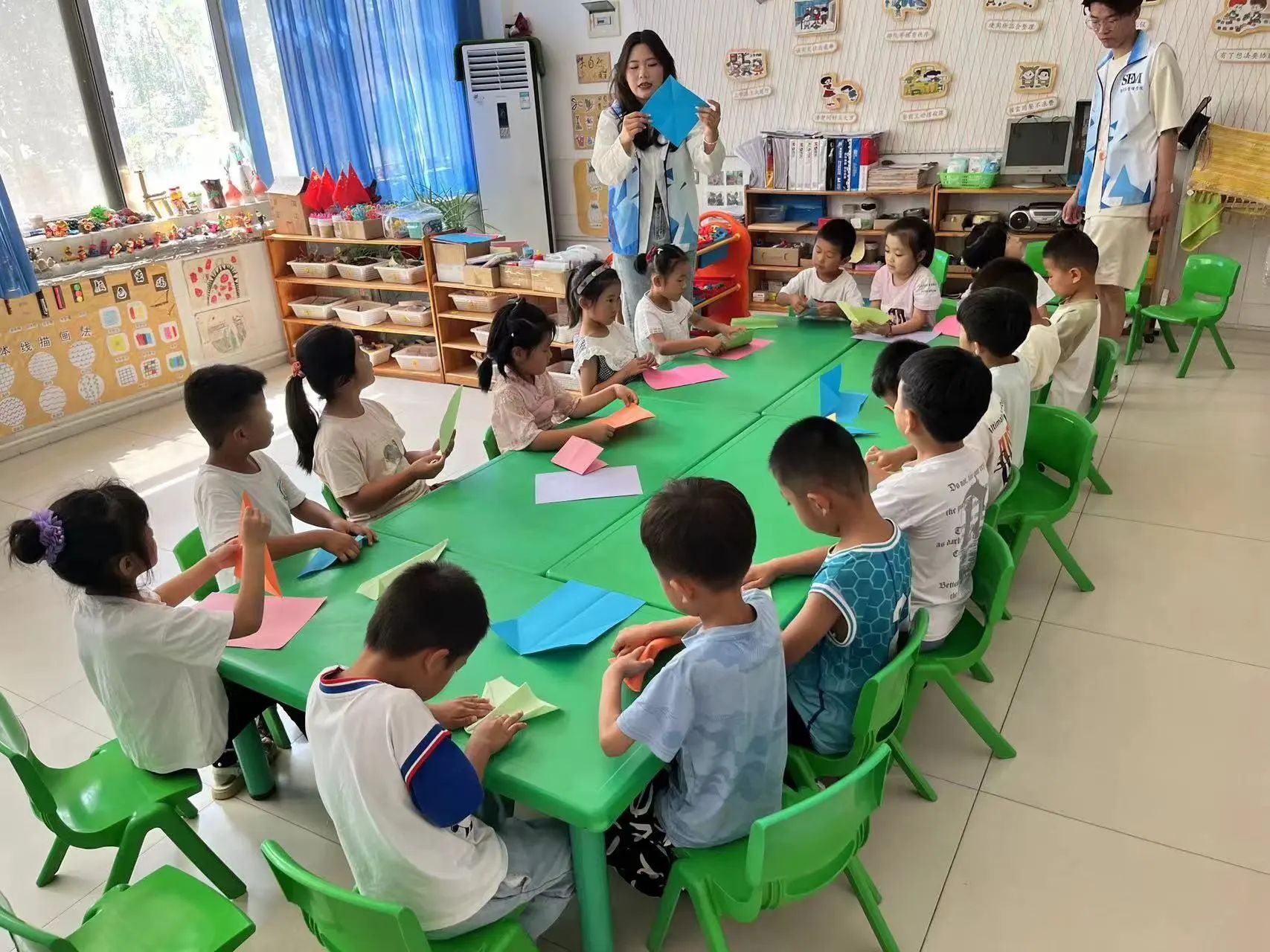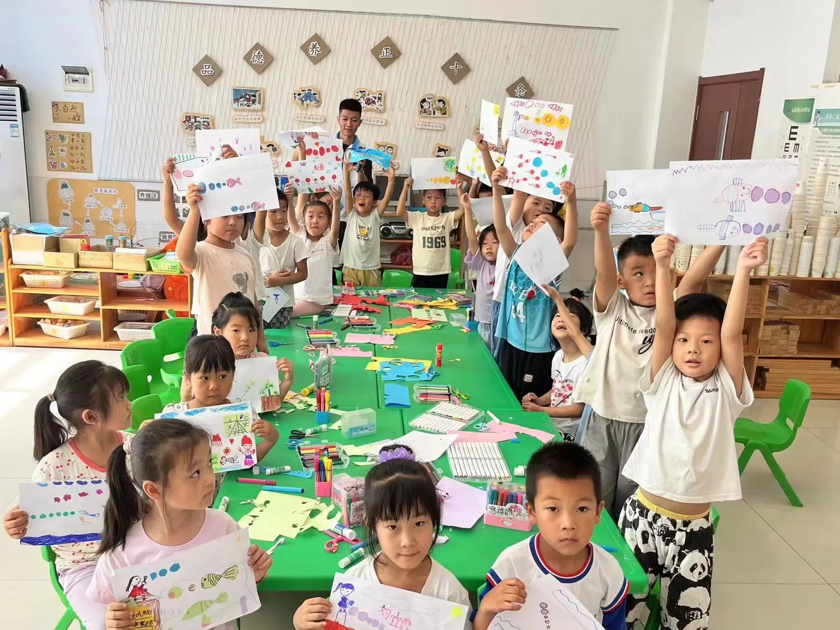 幼儿园提供了志愿者们与孩子们互动的机会,帮助孩子学习与他人合作、分享、解决冲突和建立友谊关系。通过各种方式促进孩子的认知能力、发展语言能力以及注意力和专注力的培养,今天上午我们进行了五彩泡泡的手工制作活动,首先观看了七彩泡泡的动画视频,然后给孩子们分发A4纸和彩色卡纸以及剪刀、胶棒等工具,让孩子们通过自己的实际手工制作,剪出想要的图形,粘贴到A4纸上,再配合上彩笔等工具,发挥想象力完成一副完整的图画,这个过程中,以孩子们的奇思妙想为主,孩子们要学会互帮互助,礼貌对待他人以及自我的秩序管理,锻炼了孩子们的专注力,随时向老师们请教,在这过程中也得到了老师们的积极配合,协助我们进行教学,最后在大家共同的努力下进行的成果展示。
