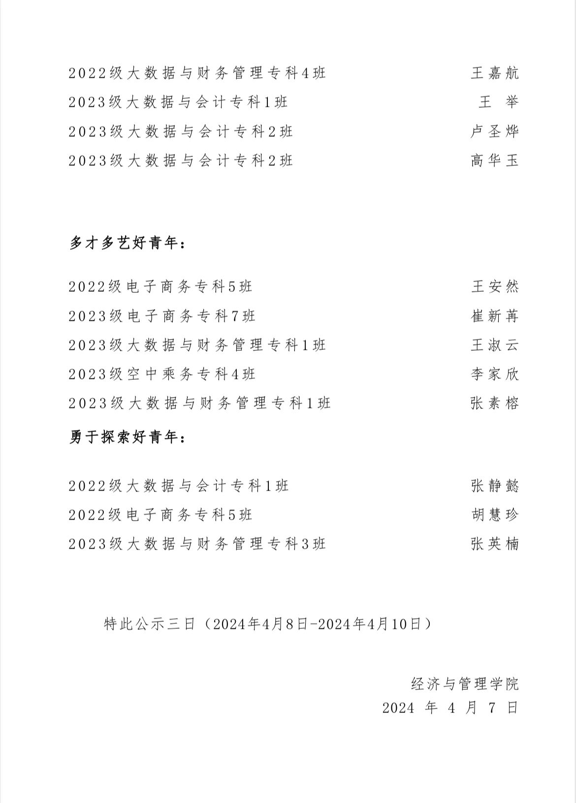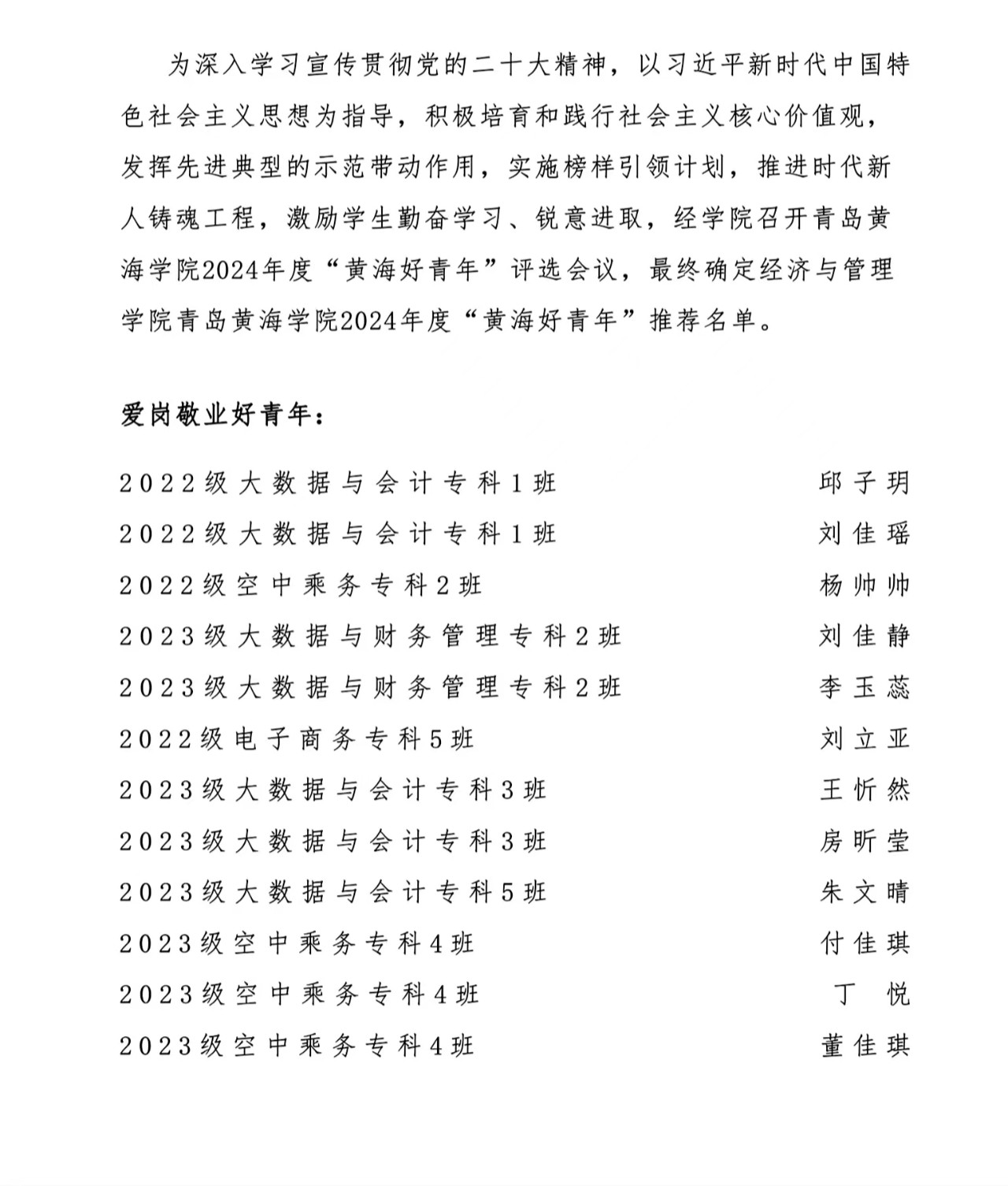 经济与管理学院2024 年度“ 黄海好青年”名单公示