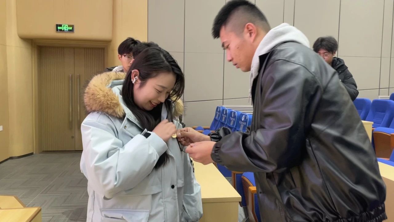 而最具仪式感的,莫过于团徽的颁发与佩戴环节,朱升学老师面带微笑,将一枚枚闪耀着光芒的团徽递到新团员手中,并亲手为他们佩戴。随后,在黄泰的带领下,新团员们面向团旗,举起右拳,庄严宣誓。“我志愿加入中国共产主义青年团……”那一声声誓言,在空气中回荡,是他们对共青团最忠诚的承诺,是他们内心深处对理想信念的坚定表达。