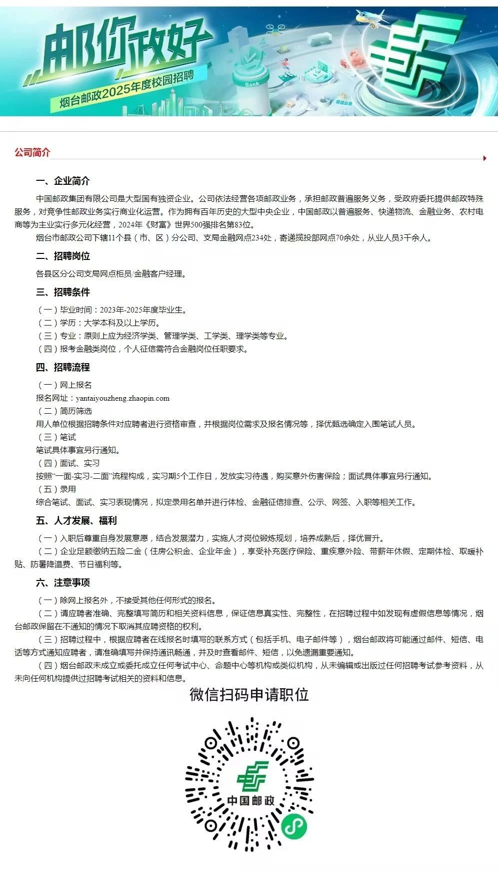 招聘信息丨中国邮政(烟台)2025年校园招聘