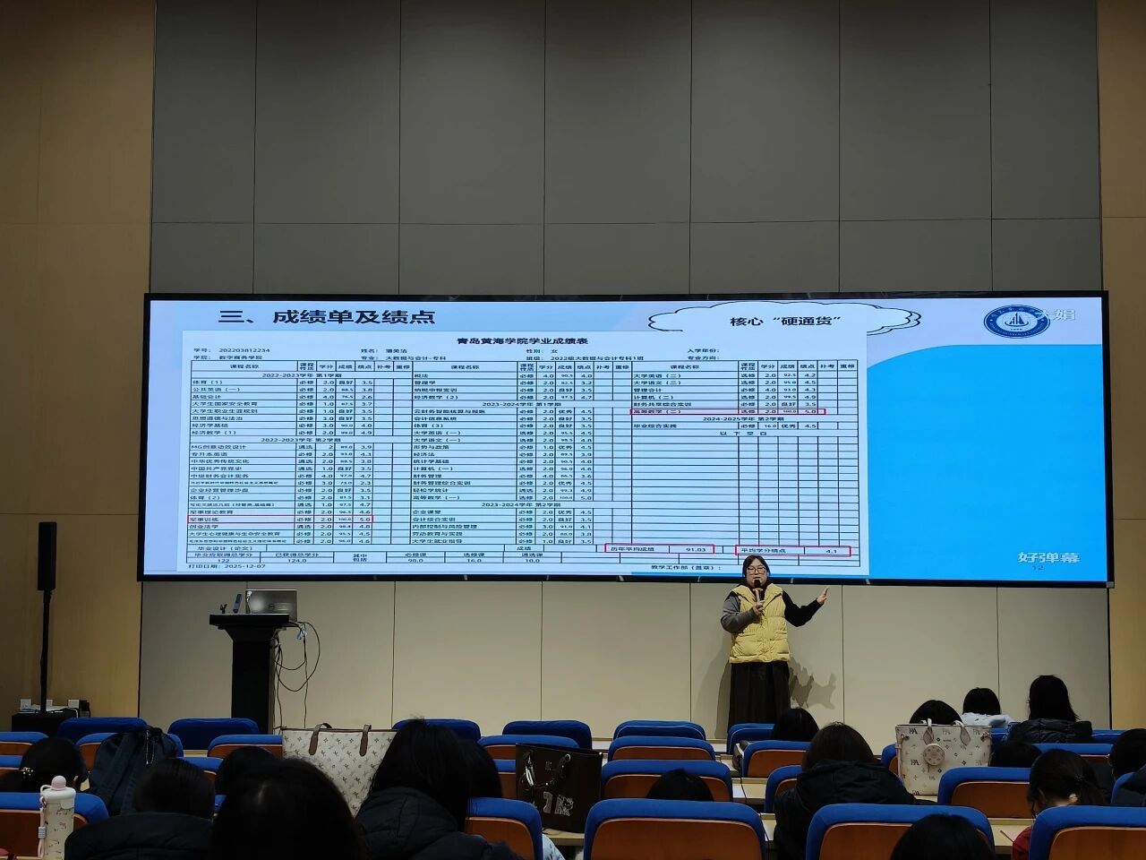 在“学业导航与成绩单深度解析”环节,孙主任详细讲解了学分构成、绩点计算方法及其深远影响。她着重强调了“成绩不仅是分数,更是学习态度、知识掌握程度和综合能力的体现”,优异的成绩单是未来升学、求职、评奖评优的坚实基础。她同时提醒同学们要时刻“遵规守纪”,良好的行为记录是大学生一切发展的前提。