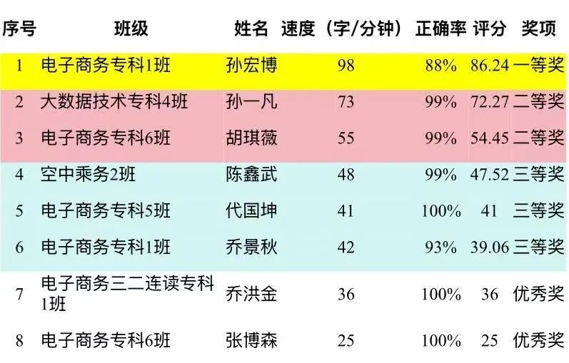 历经激烈角逐,评审组依据参赛选手的现场表现与精准数据统计,本着公平、公正、公开的原则,现将本次 “儒风杯” 电子商务技能大赛 —— 电脑打字大赛校赛的最终结果公布如下: