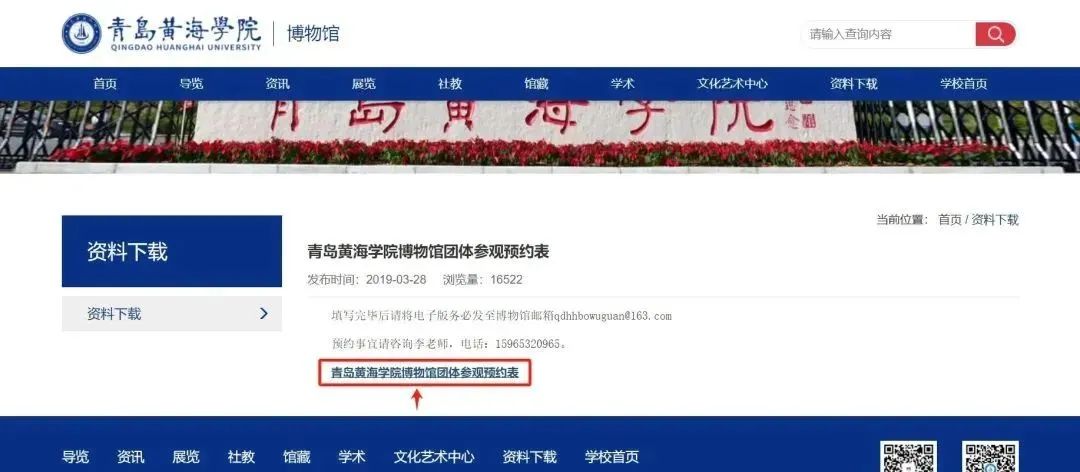 方法二:您可以登录青岛黄海学院博物馆官方网站(青岛黄海学院博物馆),按照下列步骤下载并填写雷锋纪念馆团体参观预约表。