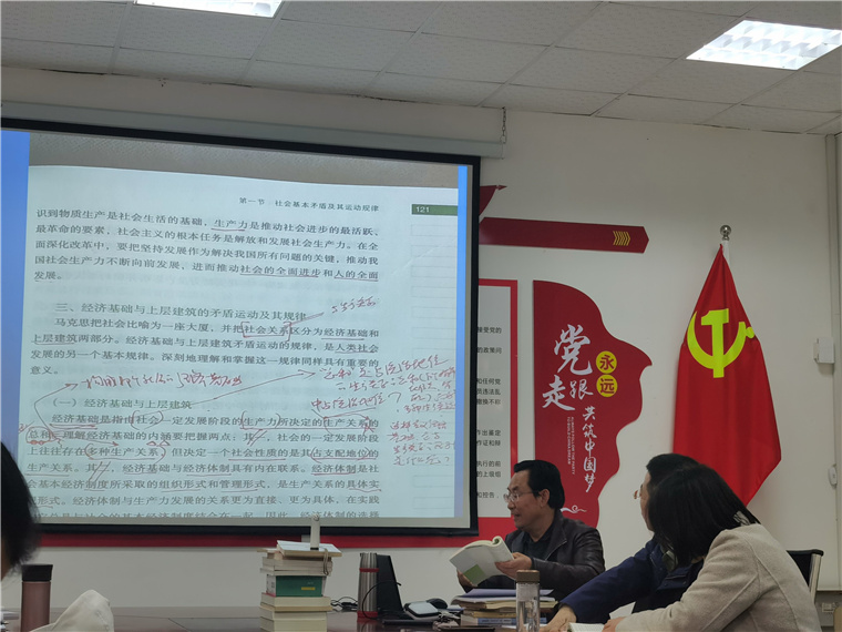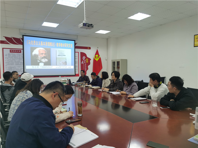 在马克思主义学院208会议室开展教学经验分享会。本次教学经验分享会由杨志银教授主讲,分享的题目是“《马克思主义基本原理》教学教材研究交流”,旨在通过对教材的研究分析、对教学过程的交流,提升思想政治理论课教学科学化水平。