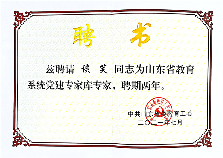 为全面加强教育系统党建工作,中共山东省委教育工委聘请在党建研究领域有建树、造诣深、有影响的专家学者作为全省教育系统党建专家,雷竞技的赛事积分马克思主义学院直属党支部书记谈笑被聘为专家库专家,聘期两年。