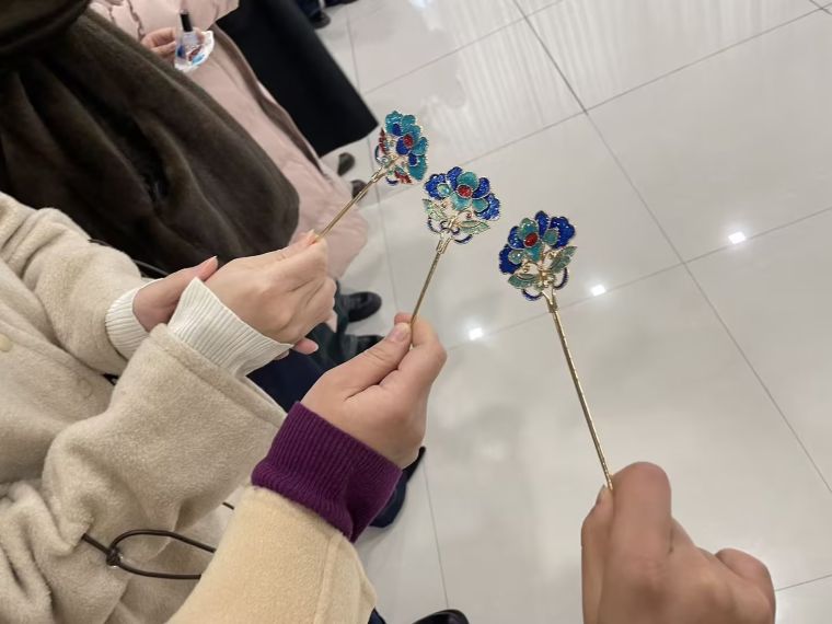 仿烧蓝工艺体验区更是氛围热烈。作为国家级非遗景泰蓝制作技艺的核心工序,烧蓝工艺承载着百年传承的东方匠心。老师们屏息凝神,专注完成点蓝、固色、等一系列工序,在素净的金属胎底上细致勾勒纹样、晕染色彩,于方寸之间雕琢古韵。