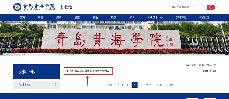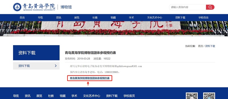 您可以登录青岛黄海学院博物馆官方网站(https://zsb.qdhhc.edu.cn/mb/1/Index.aspx?wsId=41),按照下列步骤下载并填写博物馆团体参观预约表