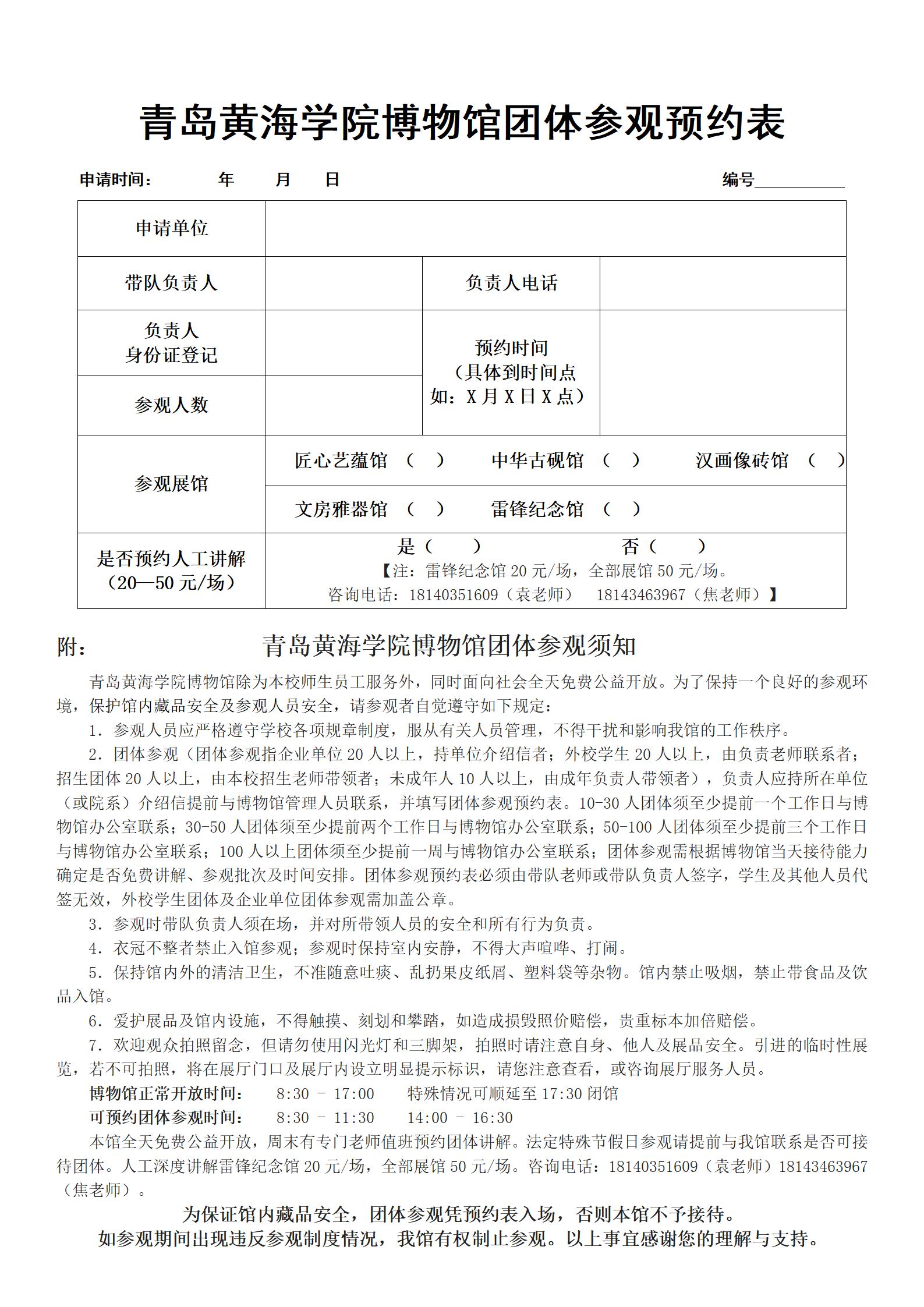 请务必提前3天预约。填写好预约表后,将其发送至博物馆邮箱(qdhhbowuguan@163.com)待工作人员跟您确认后携带打印好的预约表即可前来博物馆参观。